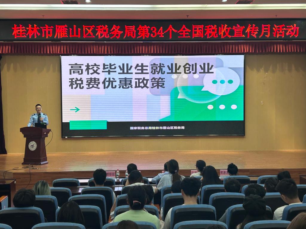 活动特别设置了税费政策专题讲座环节,由雁山区税务局税务干部唐珍定主讲。他围绕大学生创业税收优惠、企业创新研发费用加计扣除等热点政策进行详细解读,并通过案例分析帮助学生理解政策应用场景。