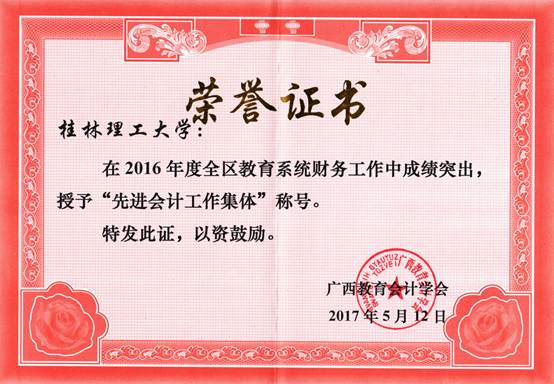 广西教育会计学会于2016年12月15日下发了《关于评选2016年度全区教育系统先进会计工作集体、先进会计工作者的通知》(桂教会〔2016〕14号)。学会成立评选工作领导小组对申报单位的材料进行了评选、审议,并上报自治区教育厅审定。太阳集团城网站2017在财务管理工作中制度完善、上报各类报表及材料准确及时、工作业绩突出,积极参与学会活动,承接学会工作认真负责,决定授予太阳集团城网站20172016年全区教育系统“先进会计工作集体”称号,对太阳集团城网站2017财务管理工作取得的成绩予以肯定和表彰。