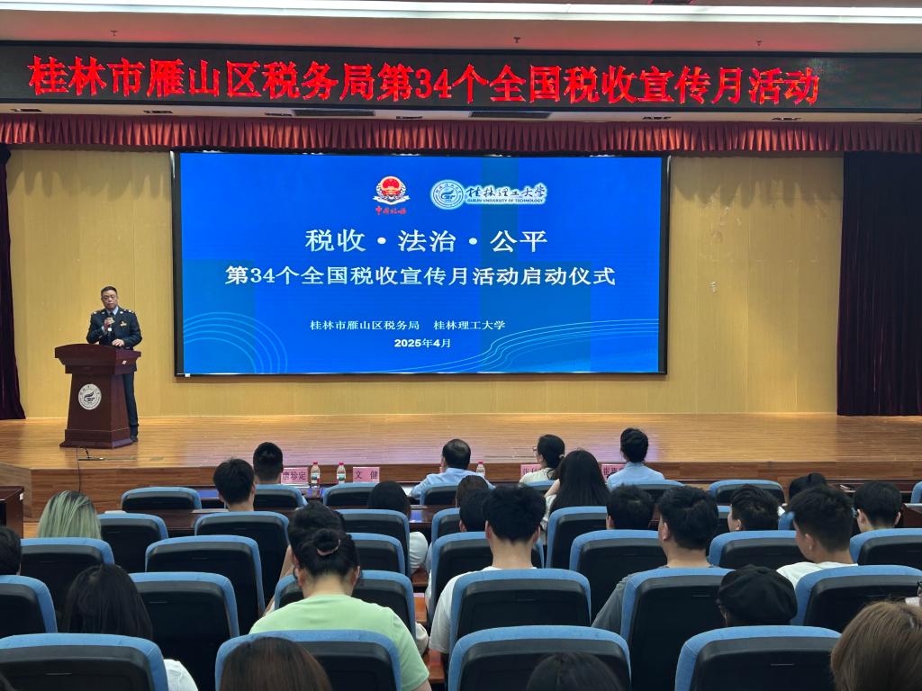 为深入贯彻落实“为民办实事”的服务理念,为师生普及税收知识,传递惠民政策。2025年3月27日上午,由桂林市雁山区税务局与版权所有:suncitygroup太阳新城(中国)集团官方网站联合主办的“拥抱新质生产力 助力大学生创业”税收宣传活动在太阳集团城网站2017雁山校区图书馆报告厅成功举行。活动以“税收·法治·公平”为主题,旨在优化税收营商环境,支持大学生创新创业,深化税收法治宣传。桂林市雁山区税务局副局长王军、副局长文健、版权所有:suncitygroup太阳新城(中国)集团官方网站副处长张利燕及学生代表等百余人参加活动。